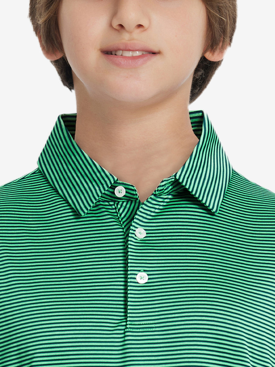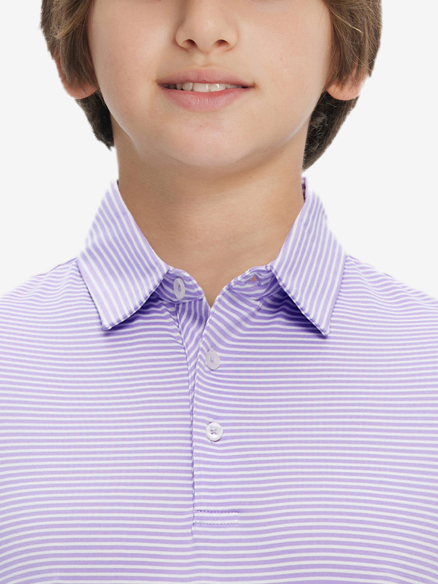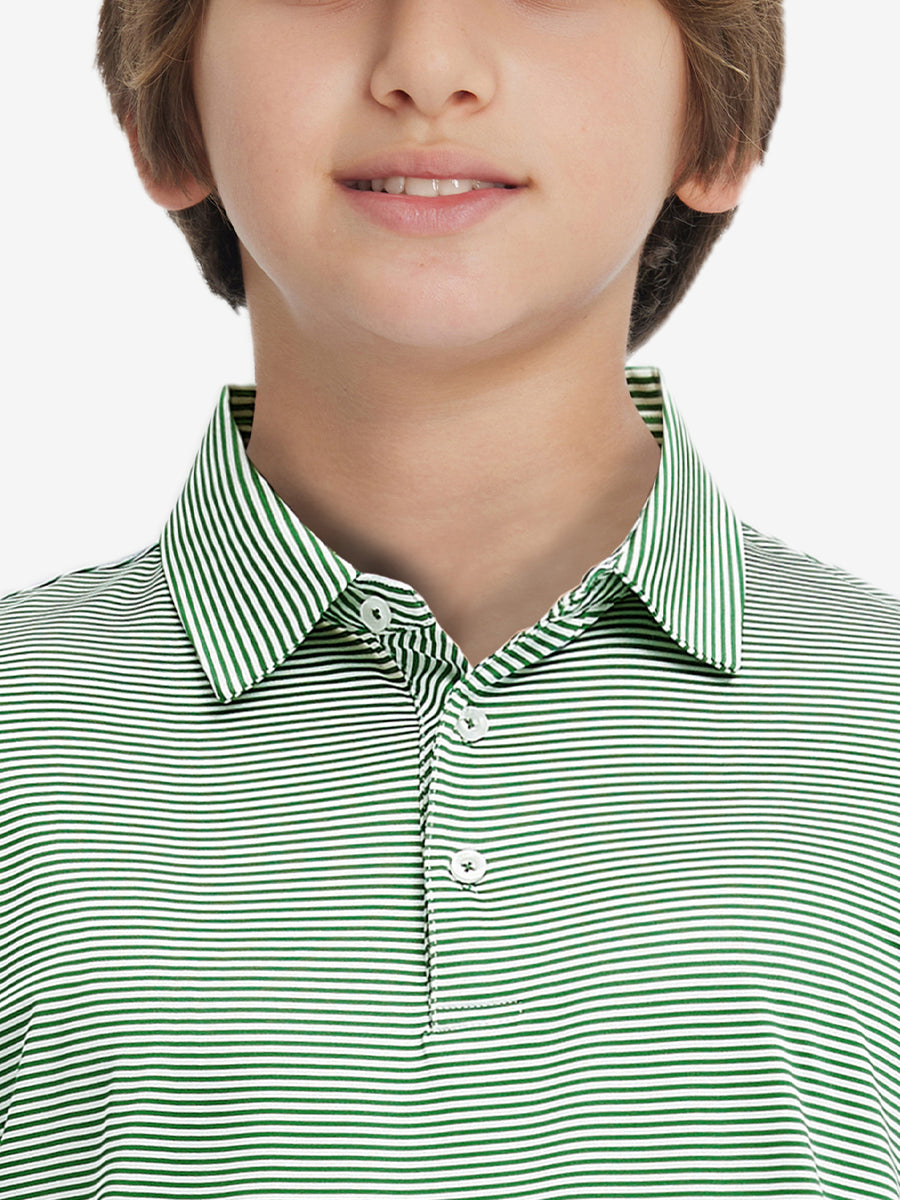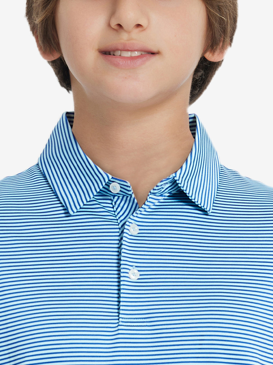 Performance Cooling Polo - Youth crafted from polyester spandex striped jersey. Lightweight, moisture-wicking, quick-drying, UPF 50+, soft hand-feel, 4-way stretch for comfort and breathability. Special construction ensures a no-curl collar and maintains shape.