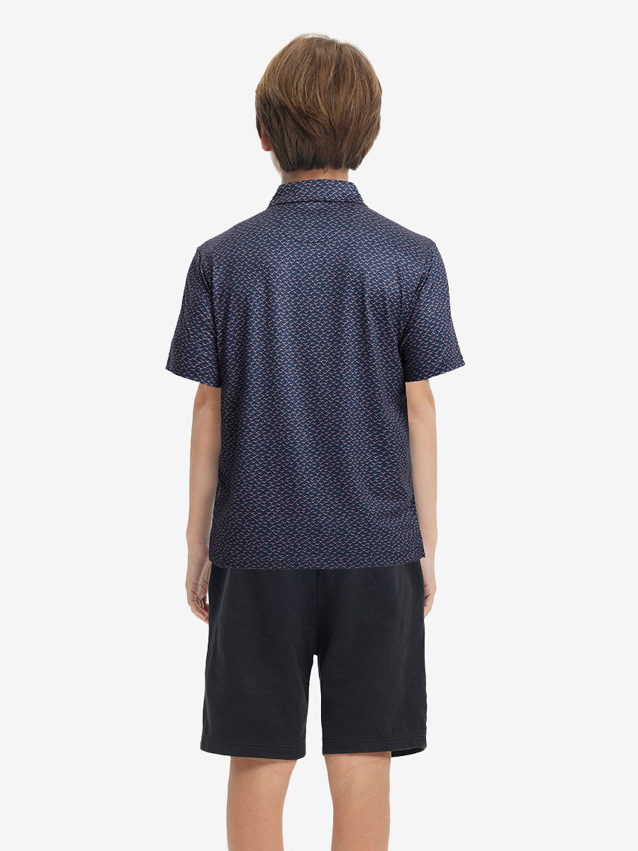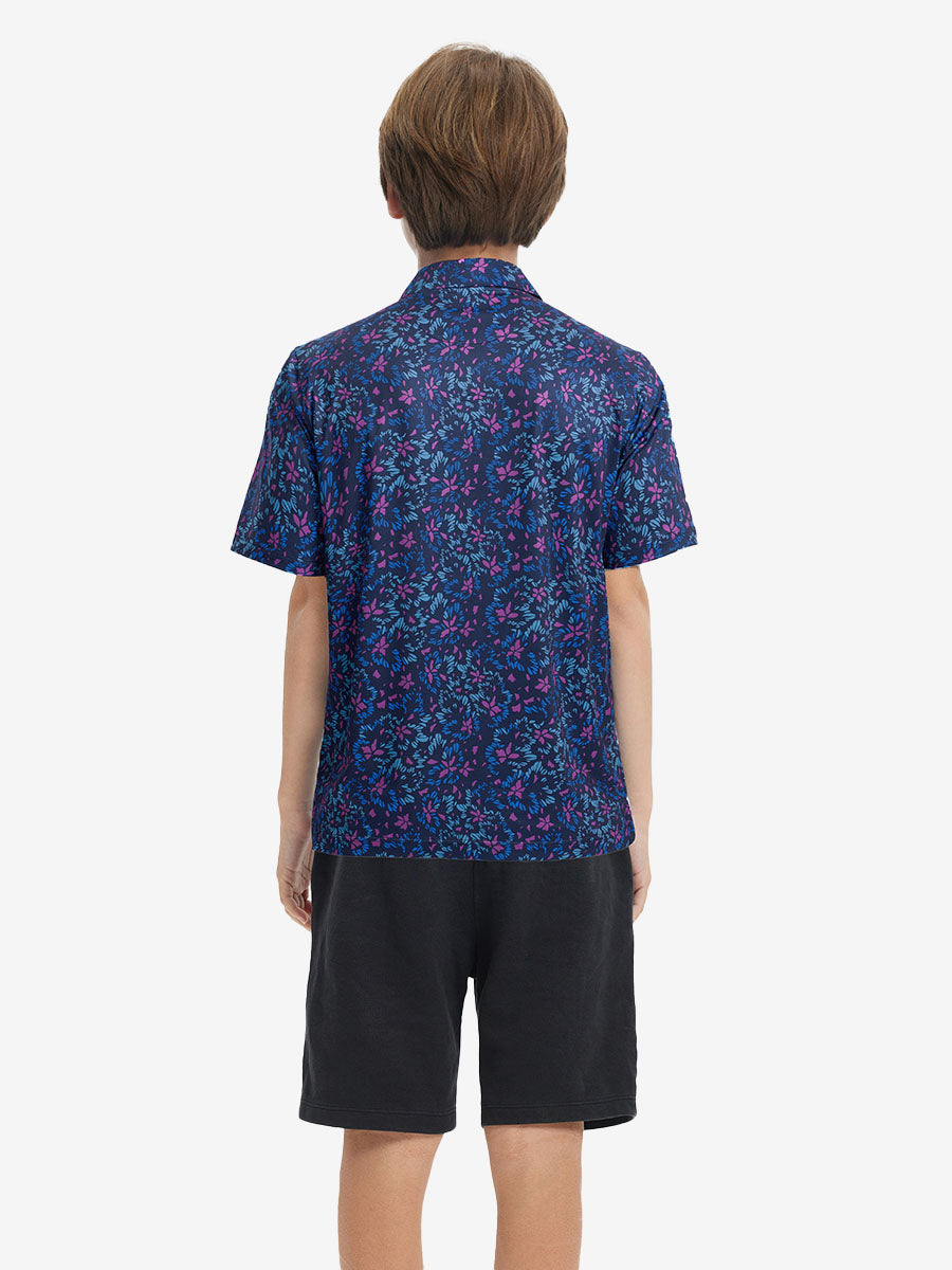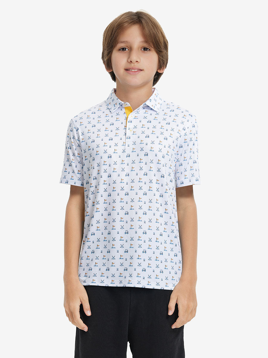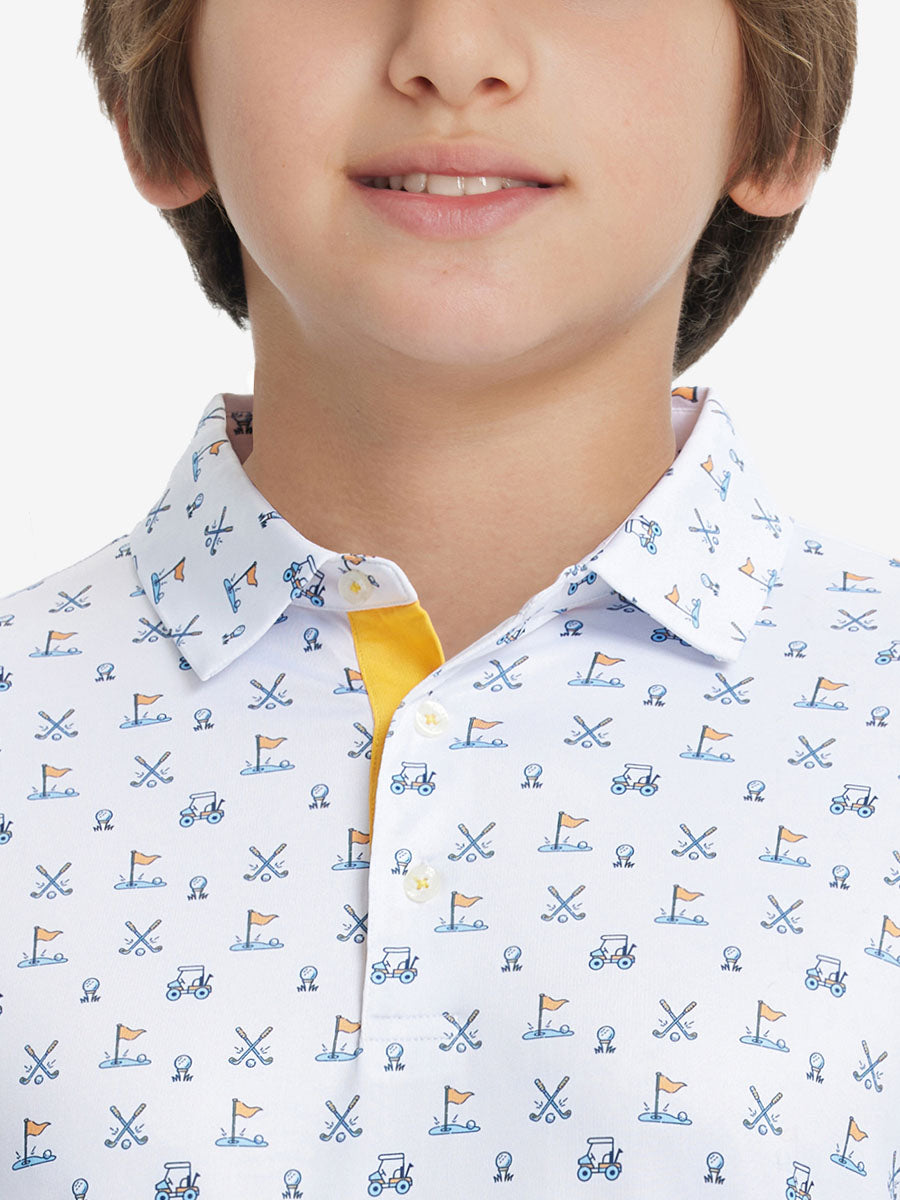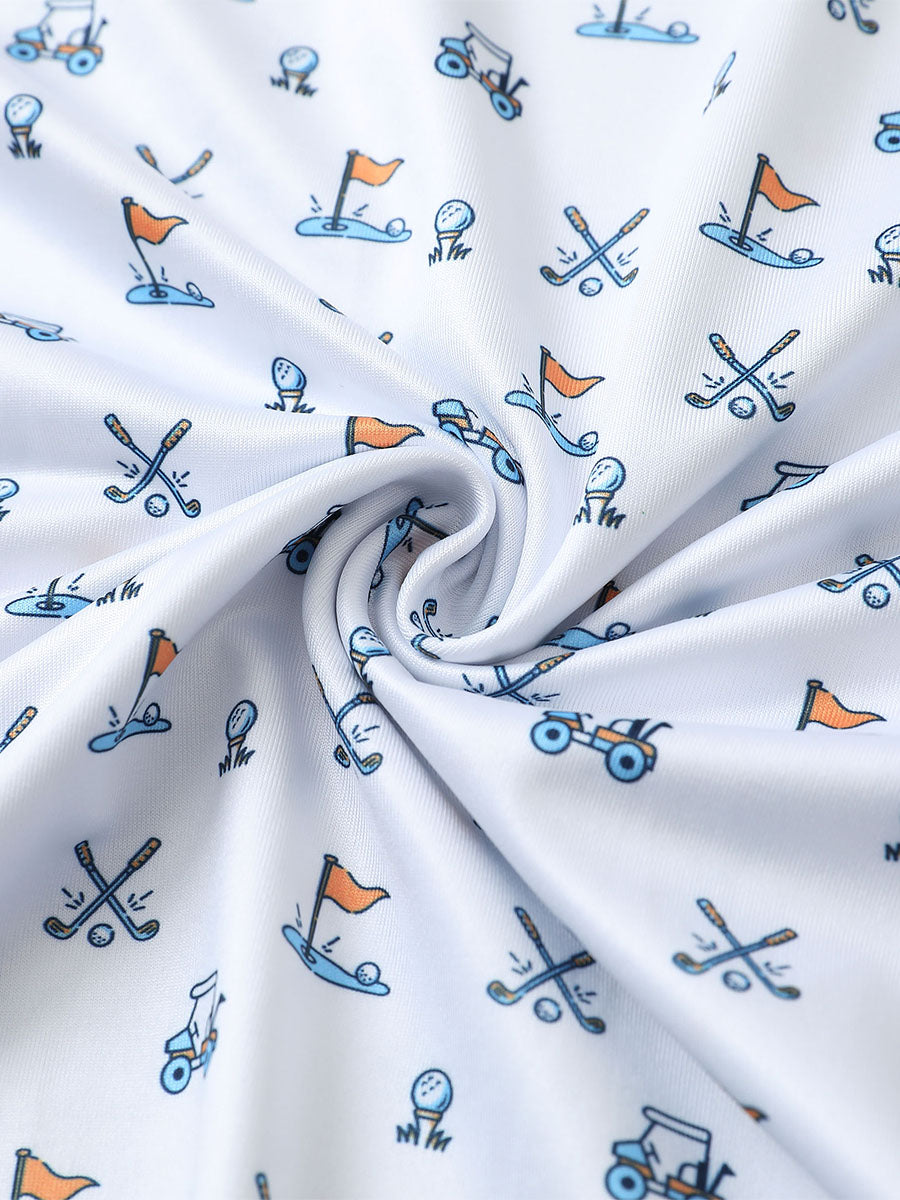 Get your little golfer ready for adventures with our 'Performance Print Boys Golf Polo'. Crafted from top-notch fabric that wicks moisture, stays light, and shields with UPF 50+. Let him swing freely with the split hem and stretchy fabric. Watch him rock the course in fun animal and plant prints that never fade, making him the cutest golfer around!